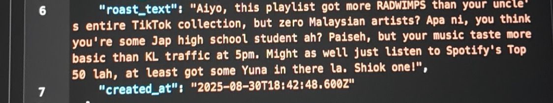 That’s how it started. Spotify API + AWS Bedrock + Malaysian cultural data = an AI that roasts playlists with authentic Malaysian humor.
